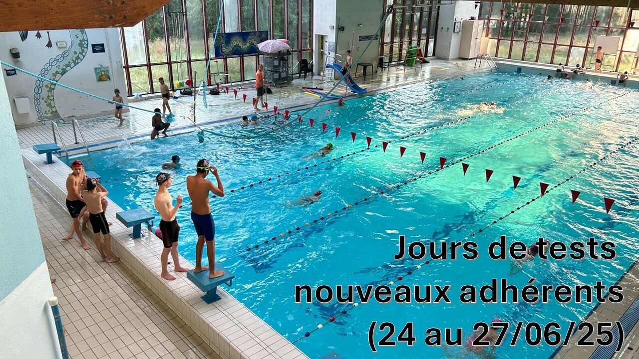 Cette année, le club organise des journées de tests dans la piscine (maillot de bain et bonnet obligatoire) pour les nouveaux adhérents pour valider le groupe d'inscription.